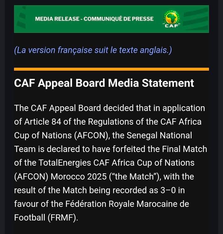 The decision issued by the Appeals Board on 17th March 2026, stated: “Senegal has lost the match; the official result of the match will therefore be 3-0 in favour of Morocco”.