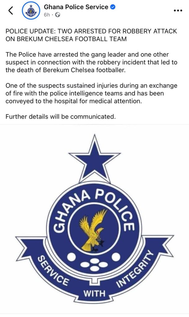 Two persons, including the presumed leader of the gang behind a robbery attack on a bus that conveyed players of Berekum Chelsea and in which a player was killed, have been arrested by the Ghana Police Service.